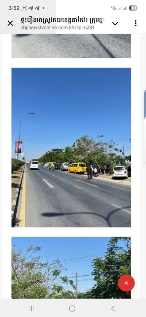 ខេត្តតាកែវ÷ អាជីវករមួយក្រុម បានផ្ទុះការតវ៉ា បិទផ្លូវជាតិលេខ២ ក្នុងសង្កាត់រកាក្នុង ក្រុងដូនកែវ នៅមុខស្នាក់ការសាខាគយខេត្តតាកែវ នៅព្រឹកថ្ងៃទី៨ ខែមករា ឆ្នាំ២០២៦ ដើម្បីទាមទារឱ្យមេគយឈ្មោះ ស៊ុន ឆាយ បន្ធូរបន្ថយចំពោះការរាប់ក្បាលឡានជំរិតយកលុយ៧០០០០៛ ក្នុងមួយឡានៗ។ពួកគាត់អ្នកតវ៉ាបានសុំបង់ត្រឹម៣០.០០០រៀលទៅ ៤០.០០០រៀល ក្នុង១ឡានវិញ.!ការតវ៉ានេះ ព្រោះមានក្រុមអនាមឹកមួយក្រុមស្លៀកពាក់សុីវិលធ្វើសកម្មភាពជំរិតឱ្យបង់ ប្រាក់ដោយមិនចេញវិក្ក័បត្រ័ឱ្យពួកគាត់ហើយបានអះអាងថាពួកគេជាគយខេត្តតាកែវ។